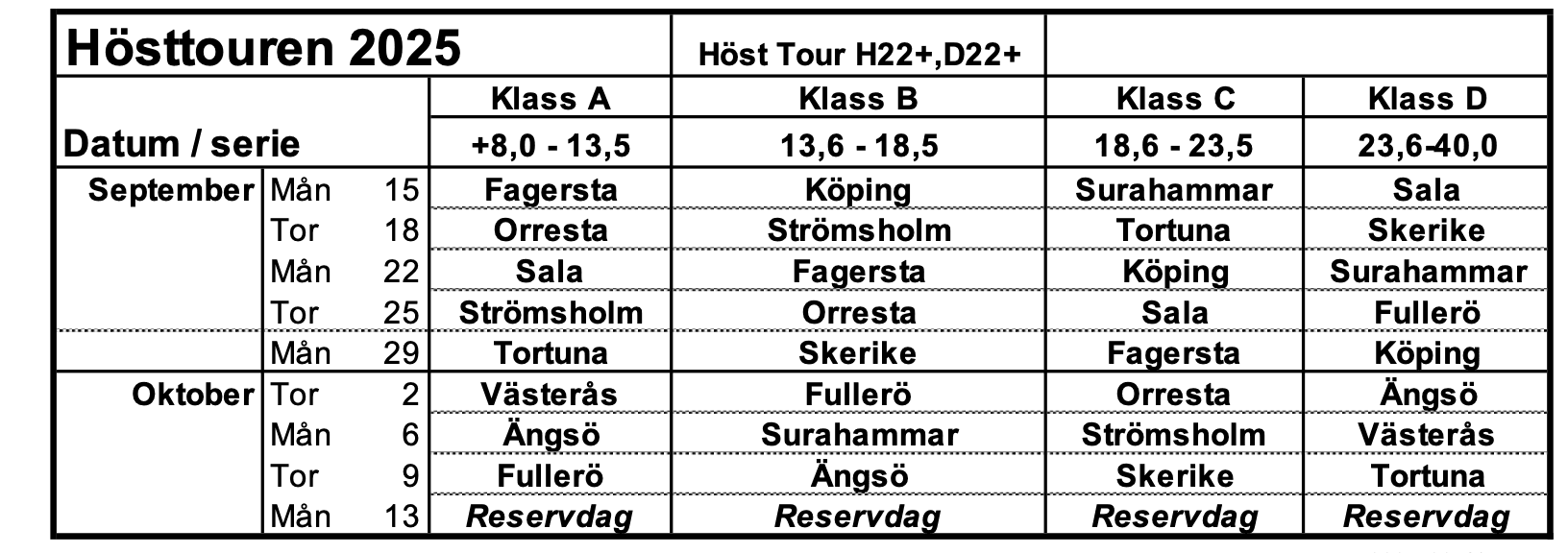 A- B- och C-klass har en spelomgång på Orresta, A-klass den 18/9, B-klass den 25/9 och C-klass den 2/10.